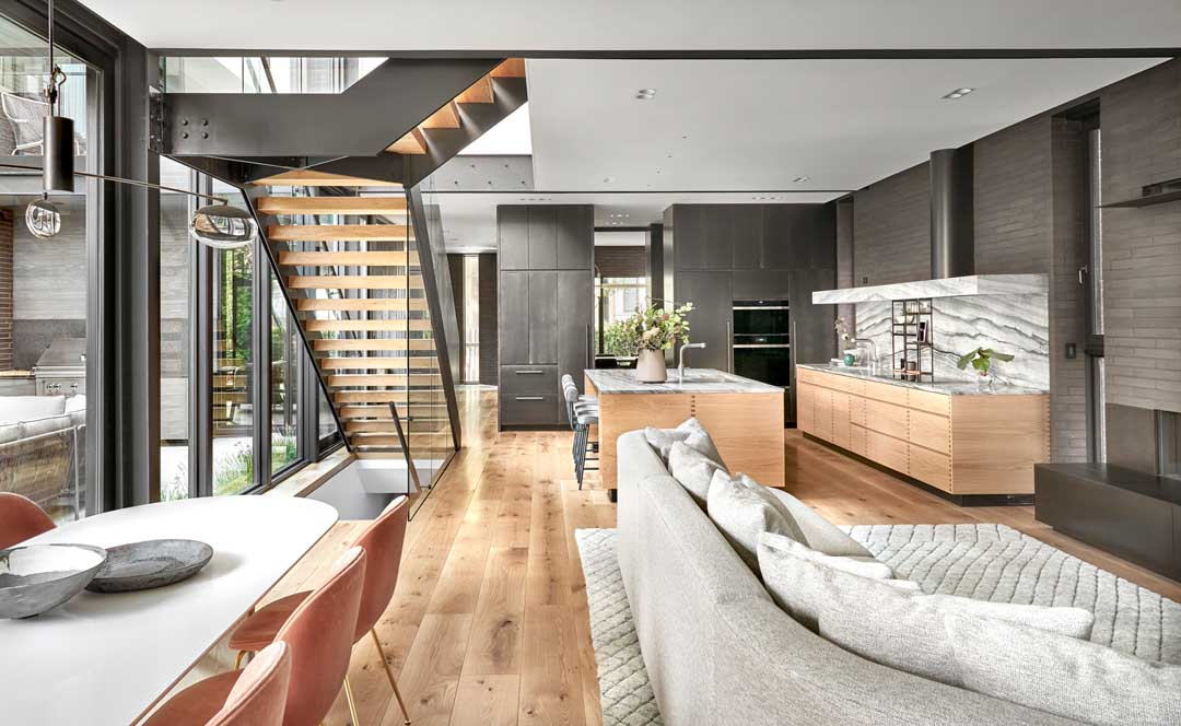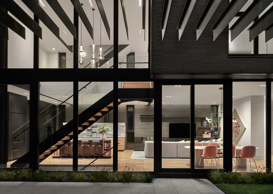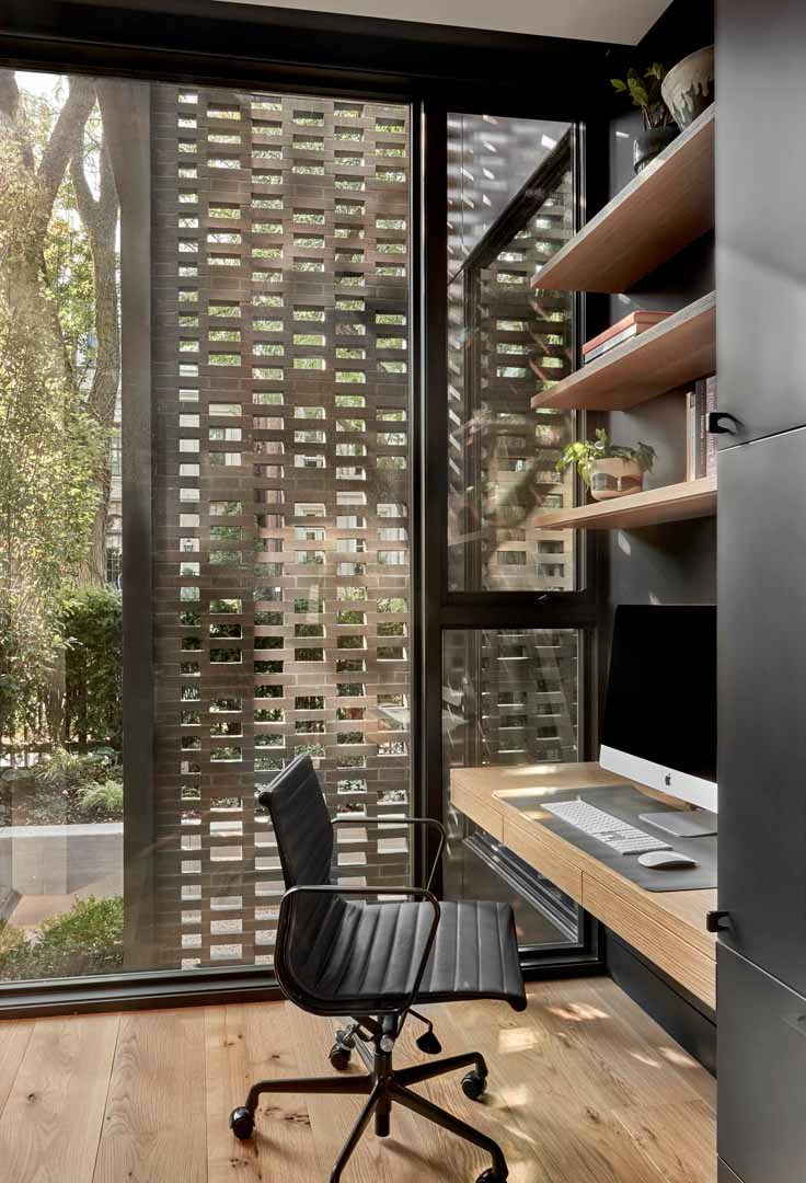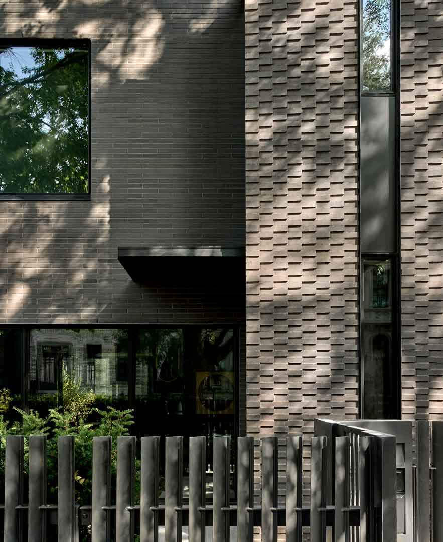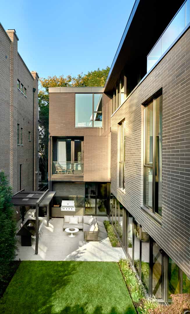 This expansion of an existing structure into a furniture design studio and showroom aims to unify and express a variety of spatial qualities—to make and house furniture, address daylighting and energy performance considerations for a south-facing facade, and build upon Chicago’s historical pattern of common brick structures with face-brick fronts. To expand the volume, common brick-bearing walls were extended vertically and due to the proximity of the property line no openings were allowed in these walls. As a result, access to light was limited to the street and yard facing edges of the building. Taking cues from Chicago’s historical pattern of face-brick fronts and common brick sides, terra-cotta colored paver bricks were employed as a brick screen on the street. This creates a distinct and contextual facade that filters natural light thereby reducing the cooling load from the direct southern exposure.